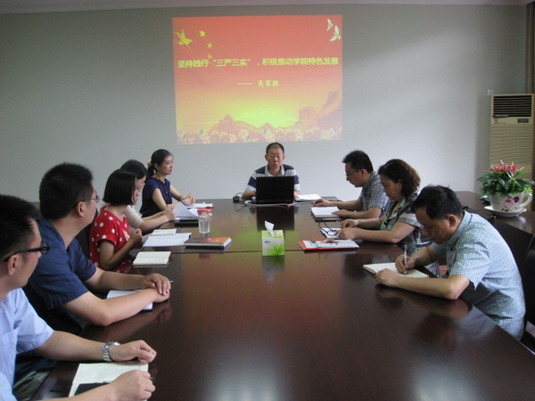 6月30日上午,国际学院在学15会议室举办“三严三实”专题教育党课,院党总支书记吴家胜作了题为“坚持践行‘三严三实’,积极推动学院特色发展”的专题党课,学院党总支委员、党支部书记、支部委员和全体党员参加了学习。