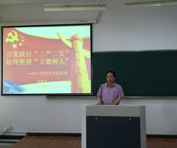 6月5日下午,外国语学院“三严三实”专题党课在教5203召开,党总支书记张敏生为学院全体教工党员作了题为“自觉践行‘三严三实’ 始终坚持‘立德树人’”的专题党课。此次党课紧紧围绕学校党委关于在处级以上干部中开展“三严三实”专题教育的实施方案,结合学院教工党员中存在的“不严不实”问题,重点阐述了教工党员如何按照“三严三实”要求,从实做好“立德树人”。
