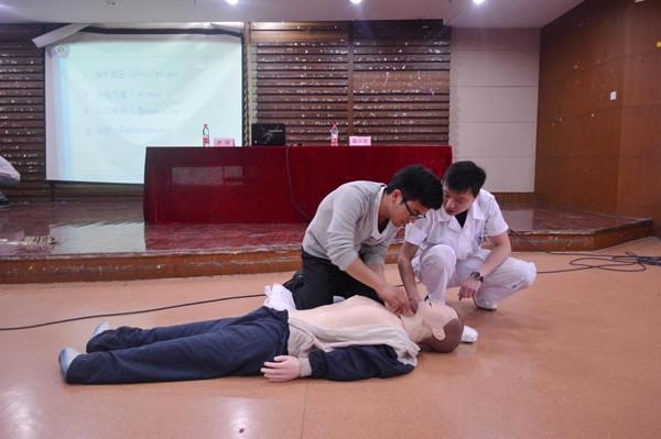 讲座现场,曹霞医生在生动讲解了如何进行心肺复苏的理论知识后,亲自示范,不断细化急救各个步骤,并与现场同学们进行交流互动。在场的老师和同学也积极配合,认真参与到现场急救演练活动中,在医生指导下,进行了现场模拟操作,将理论与实践相结合,熟练掌握了现场急救需要处理的各个步骤,扎实有效的掌握了现场急救技能。
