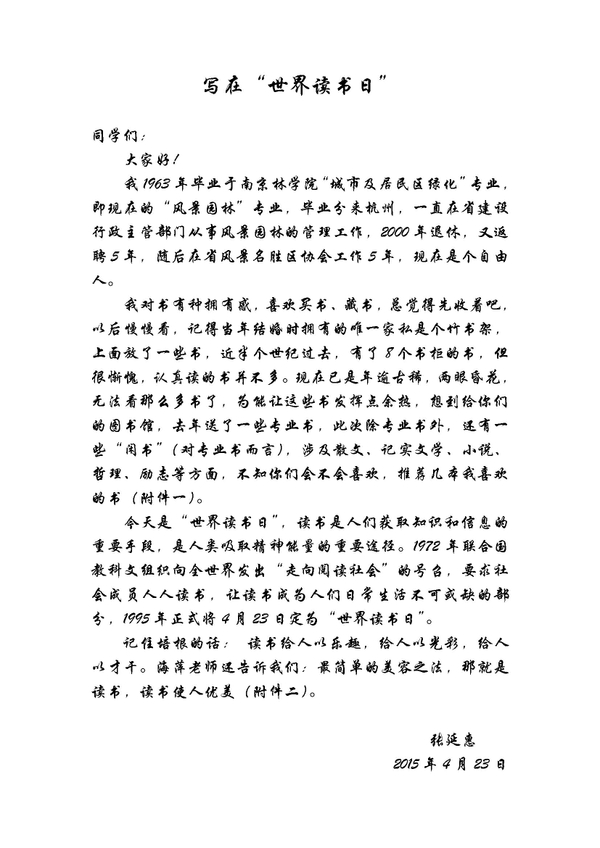 4月23日是第20个“世界读书日”,当天,我国著名风景园林专家张延惠将毕生所藏图书捐赠给园林学院,并写信给园林学子,鼓励他们多读书、读好书。