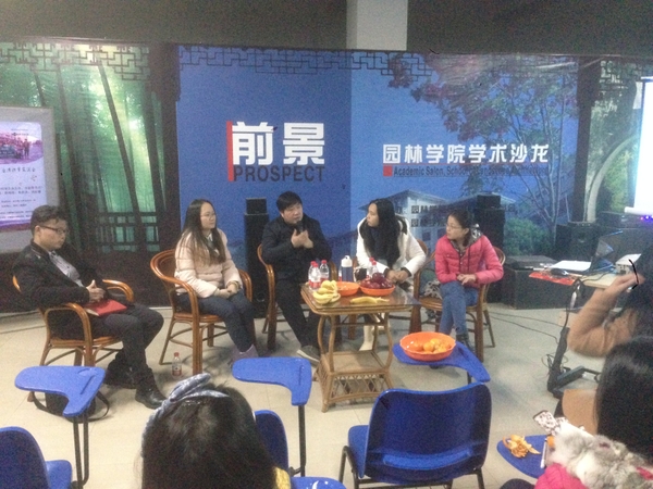 主讲嘉宾通过本次访学所拍摄的大量实景照片,介绍了台北街头创意文化、台北松山创意产业园、中原大学的“乐学园”、“大树教室”等特色校园景观,向大家传达了台湾高校学生快乐学习的理念;通过展示日月潭、阿里山的自然山水风光,台北科技大学、东海大学、台湾大学的人文风光,给同学们展现了一个美丽的台湾。沙龙最后,主讲嘉宾总结了本次访学团之行,认为台湾高校在园林专业的教学理念上的“全球性视野,本土性教学”理念值得我们学习和借鉴。台湾高校的校园景观特色和教育理念激发了在场师生的浓厚兴趣,嘉宾对同学们的提问都进行了详细解答。在场师生与嘉宾还进行了“你来比划我来猜”的互动环节。