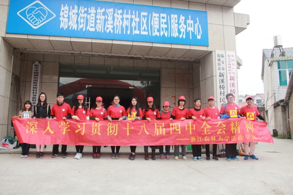 为积极响应十八届四中全会提出的依法治国总目标,全面深入学习贯彻会议精神,增强学生服务社会意识,法政学院于11月15日下午走进临安市锦城街道新溪桥村,举办了以“沿着村民的脚步走进十八届四中全会”为主题的活动。法政学院雷锋班学员、村官学院学员、新溪桥村大学生村官、新溪桥村村民等参加了本次活动。
