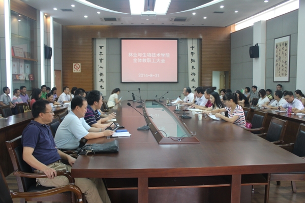 8月31日上午,林生院在智能楼大会议室召开新学期第一次全体教职工大会,学习2014暑期中层干部扩大会议精神,部署新学期学院主要工作任务。学院全体党政工领导及全体教职工参加会议,会议由学院党委书记孙勤龙主持。