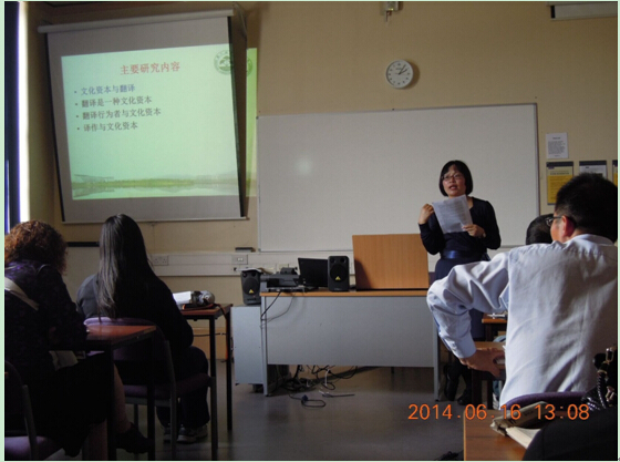 6月16日下午,外国语学院教师陈秀应邀为在英国曼彻斯特大学举行的翻译中心(CITS)第五次访问学者学术沙龙做了一场题目为“翻译研究的社会学途径——以布迪厄社会学理论为指导”的学术讲座。