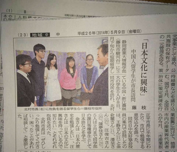 浙农林大新闻网讯 5月8日,我校赴日本静冈产业大学情报学院留学的5名同学在藤枝市市役所受到日本静冈县藤枝市市长北村正平的亲切接见。当地主要报纸《静冈新闻》对此进行了报道。