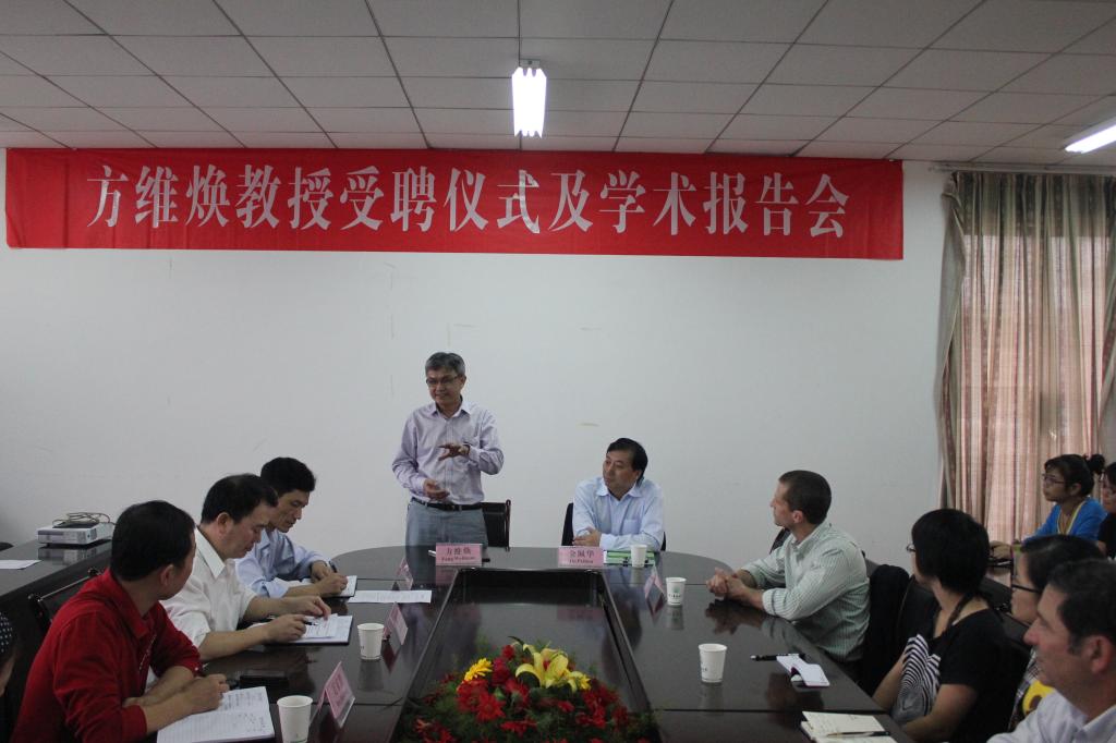 金佩华代表校党委、行政对方维焕教授加盟浙江农林大学表示欢迎和感谢,指出学校第一次党代会已经明确指出,学校要实现生态性创业型大学的中长期发展战略目标,必须加强内涵建设,实现从教学型向创业型、从学院到大学的两个转型,随着学校从过去的“林学”向“农林学科”的深入推进,养殖业与动物科学的发展尤为关键。在学校及学院的关心重视下,现在动物学科发展有了一个很好的基础,在学校的中长期发展规划的“1030”战略重点中,动物健康养殖及新型饲料就是其中一个重大领域,因此动物学科具有良好的发展前景。但学科的发展关键还要有人特别是要有领军人物,相信方维焕教授的加盟对于动物学科团队建设再上新台阶、学校动物科技学院的顺利筹建与发展必将起着极大的引领与促进作用。