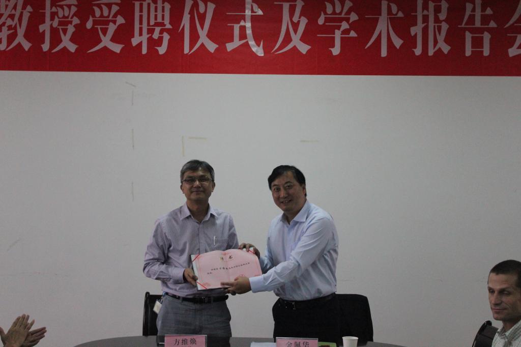 仪式上,方陆明介绍了方维焕教授的基本情况并代表学校与方维焕教授签署聘任协议。金佩华向方维焕教授颁发聘书并为其佩戴学校校徽。