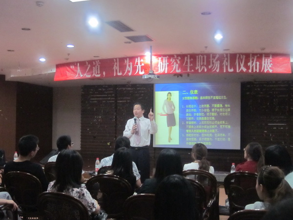 为拓展研究生职场礼仪知识,5月28日,研究生部分团委和研究生会组织了“起航校园,赢在职场”专题报告会。报告会由国家高级人力资源管理师张瑞亭老师主讲,整个报告会分为三个环节:职场礼仪、面试技巧和互动答疑。