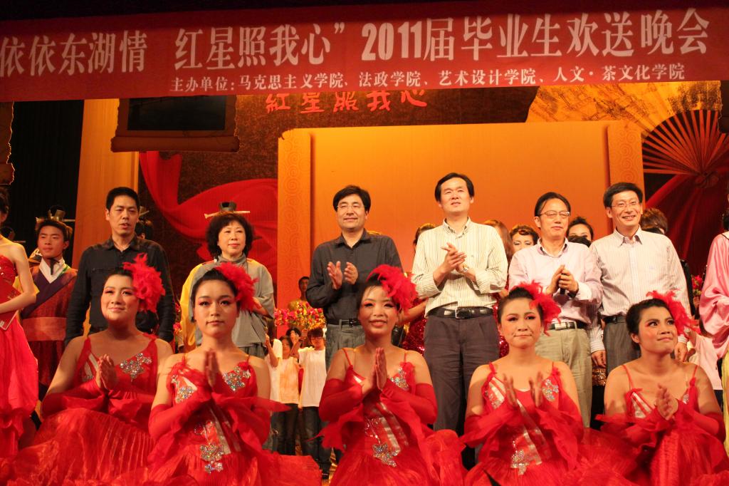 5月28日晚,由马克思主义学院、法政学院、艺术设计学院、人文·茶文化学院联合主办的“依依东湖情,红星照我心”2011届毕业生欢送晚会,在东湖校区活动中心影剧院拉开帷幕。校党委副书记宣裕方,党委委员、工会主席汪士华,以及组织部、宣传部、学工部、图书馆、保卫处等部门负责人出席了晚会。