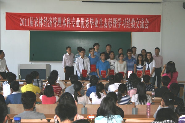 5月29日,林业经济管理学科举办2011届农林经济管理本科专业优秀毕业生表彰暨学习经验交流会。经管学院党委书记胡云江,副院长陶宝山,党委副书记陈劲松,以及林业经济管理学科全体教师参加了会议。