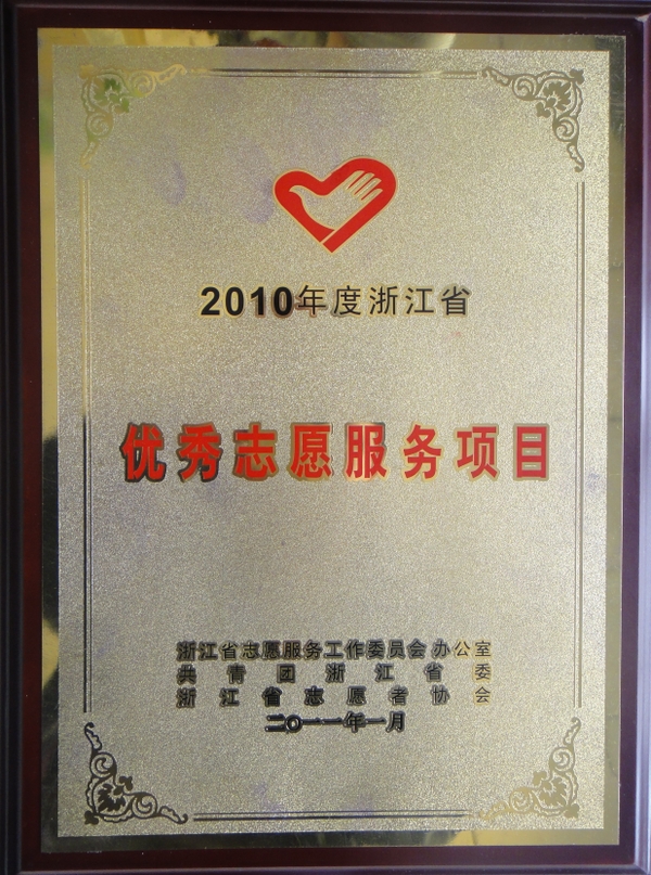 近日获悉,由浙江省志愿服务工作委员会办公室、共青团浙江省委、浙江省志愿者协会联合发文表彰了2010年度全省志愿服务工作中涌现出的先进集体和个人。由浙江农林大学校团委主办,浙江农林大学附属小学、校青年志愿者协会、工程学院分团委联合承办的“大型义务教育系列志愿者服务活动”荣获2010年度浙江省优秀志愿服务项目称号。