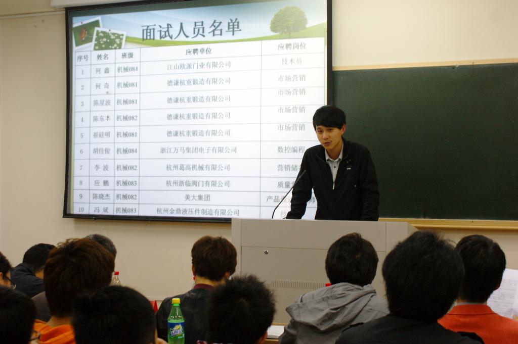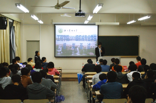 4月21日晚,工程学院2008级机械设计专业和交通运输专业、农业机械专业模拟求职面试会举行。此次模拟面试由三分钟的自由陈述、四分钟的评委提问和三分钟的评委点评构成,主持人、统分、计时、引导、群众评委等均是学生自愿报名,20名选手精心准备,其他同学现场观摩学习。浙江万马电子有限公司人事经理胡林妹女士应邀来到现场与学生面对面交流,介绍了职场上的环境适应、人际关系等方面的技巧,并就简历制作、仪容仪表、应变能力、回答问题技巧等提出改进建议。