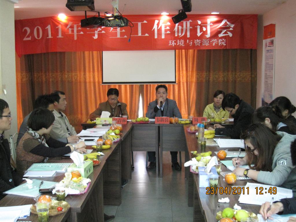 4月23日,环境与资源学院召开了2011年学生工作研讨会,院党总支书记韦新良、副院长周珊、副书记吴青林出席,各专业负责人、各年级班主任和全体辅导员参加了本次会议。会议由院党总支副书记吴青林主持。
