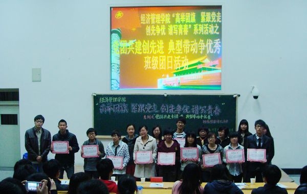4月11日晚,经济管理学院分团委举办了“高举团旗 紧跟党走 创先争优 谱写青春”系列活动之“党团共建创先进,典型带动争优秀”班级团日评比活动。