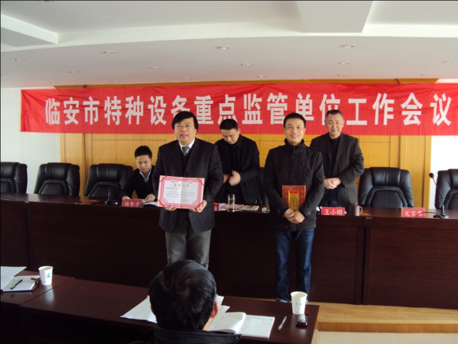 会上,经过临安市质量技术监督局对2010年27家特种设备重点监管单位的现场检查和目标责任完成情况的考核,我校等共7家单位获得了“2010年度临安市特种设备重点监管单位安全目标管理责任制考核优秀单位”的荣誉称号,受到了临安市质量技术监督局的通报表彰。