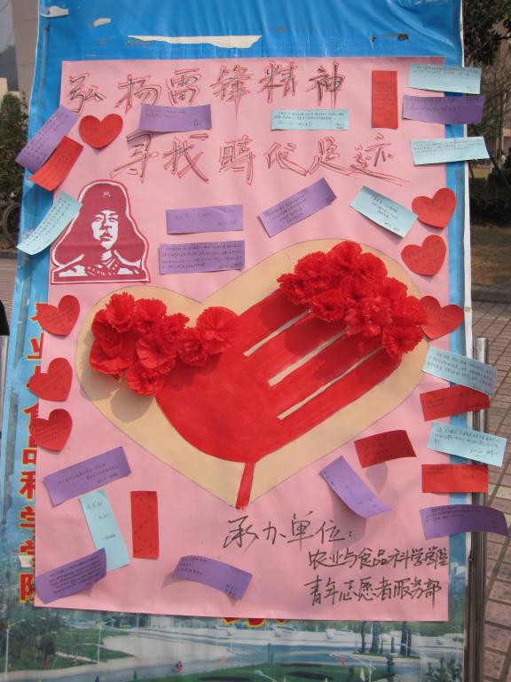 为了丰富学生校园文化生活,推进和谐校园建设,3月4日,农业与食品科学学院青年志愿者协会在东湖食堂广场开展了弘扬雷锋精神活动。活动以“弘扬雷锋精神,寻找时代足迹”为主题,通过图片展示的方式,展出了雷锋同志生前的照片、主要事迹和经典语录等。同时,还展出了学校及学院开展的志愿者活动图片,将雷锋精神与新时代的志愿者精神相结合,体现雷锋精神的时代进步性。除图片展示外,学院青年志愿者协会还举办了一个贴红花表心愿活动,同学们贴上红花并写上自己对学雷锋活动的感受。
