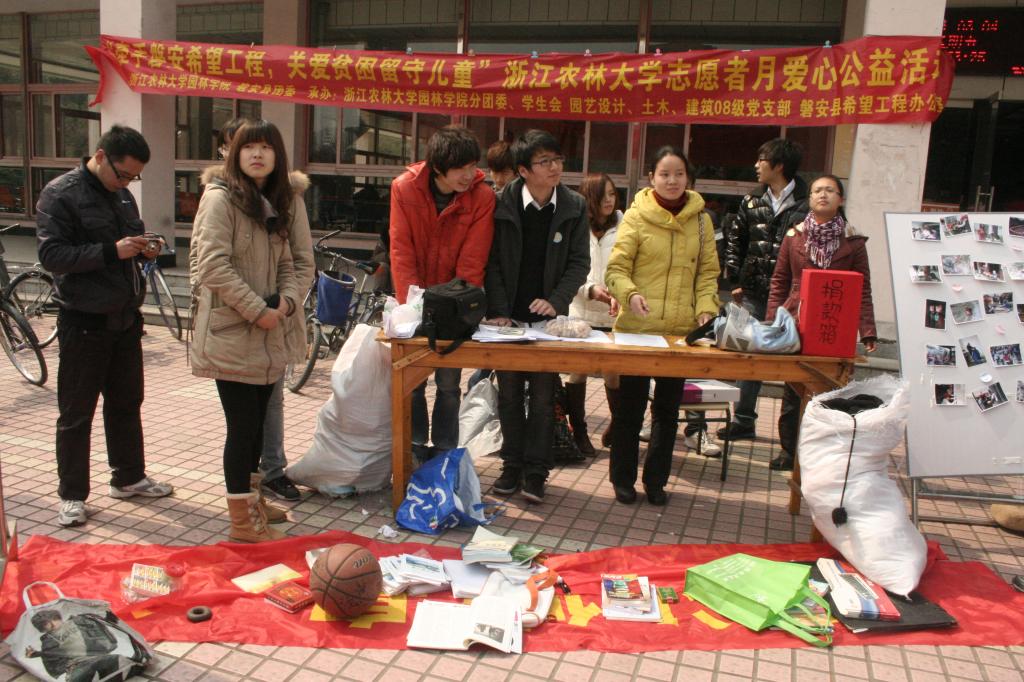 3月5日是第12个“中国青年志愿者服务日”。当天,由我校园林学院和磐安团县委共同发起举办、园林学院分团委学生会、磐安县希望工程办公室承办的“牵手磐安希望工程,关爱贫困留守儿童”志愿者爱心公益活动在东湖校区和衣锦校区举行。活动旨在为磐安县贫困留守儿童募捐学习用品等物资,以帮助他们更好的完成学业,渡过难关。