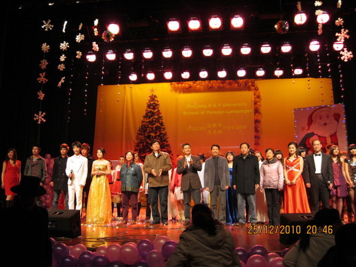 流光溢彩的舞台,装饰华美的圣诞树,热情洋溢的开场舞拉开了晚会的序幕。圣诞老人发糖果,空降许愿瓶等新颖形式掀起了晚会的第一个高潮,浓烈的节日氛渲染全场。音乐剧,话剧,歌曲,舞蹈和中西合璧的乐器表演,响起不断的欢呼和掌声。Together as One带给大家冬日圣诞的温馨,方伟副书记一曲日文版 “北国の春”更是展现了我校宽阔胸怀,A Girl and Her Tree体现了学校校生态文化理念,话剧“杜子春”揭示了中国历史文化的异域播撒,Fashion Show展现了外院师生的风采。晚会温馨与热烈相互交织,驱走了冬日的寒冷,展示出了蕴含在校园里的时尚。