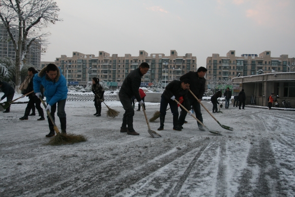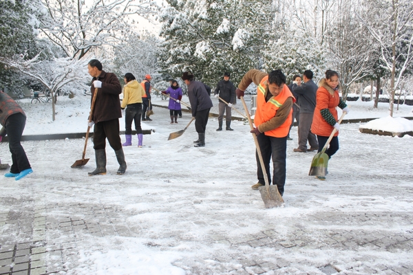 12月15日晚,在后勤集团总经理吴通苗的带领下,后勤集团各部门相关负责人,深入一线进行实地走访、巡查,现场指挥、部署防雪抗冻工作。12月15日晚上11点左右,雪势减小,气温下降,路面开始上冻。后勤集团连夜紧急采购抗雪防冻物资,并积极动员全体义务消防员和党员投入到清扫校园积雪的工作。12月16日清晨6:30,在后勤集团负责人的统一指挥下,铲雪工作紧张、有序进行。一支100多人组成的扫雪防冻队伍,进行了明确分工,分别在主干道、行政楼、教学楼、教室、食堂等公共场所全力开展扫雪、铲雪工作。后勤员工不畏寒、不惧冷,热火朝天地投入到除雪工作中,全力以赴确保学校教学、科研、师生生活的正常进行。