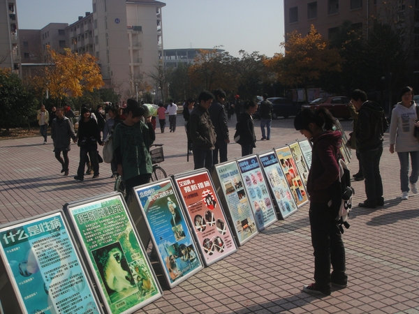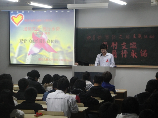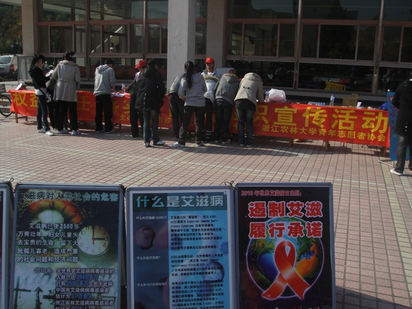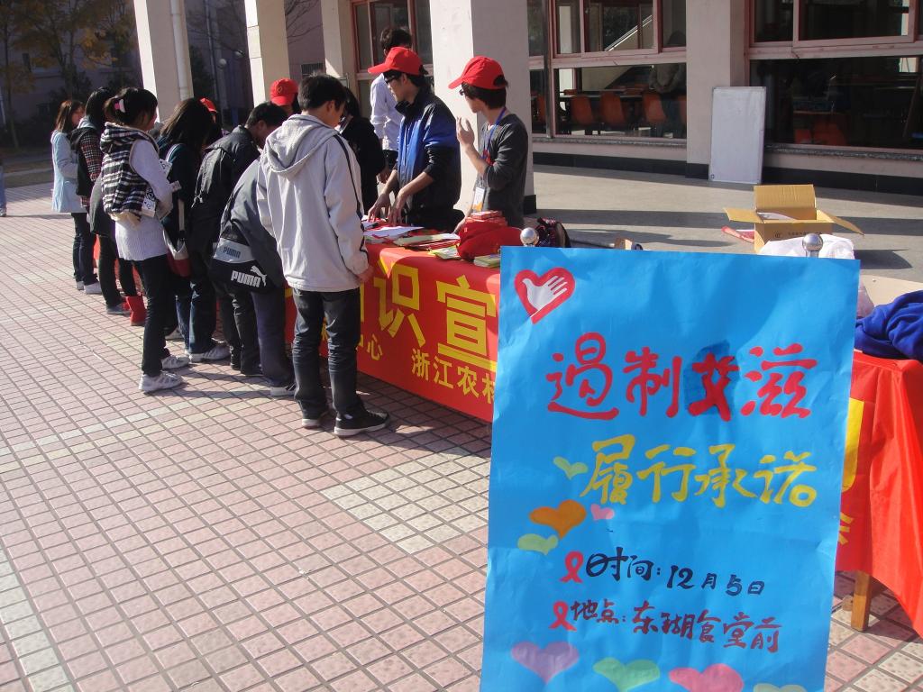 继12月1日在临安人民广场进行防艾宣传后,预防艾滋的宣传活动进入学校。“艾滋病的传播途径有哪些?它到底怎么预防?”带着这些问题,校青协于12月3日晚组织志愿者在教二303观看了《红丝带》宣传片。12月5日校青协在东湖食堂前举行防艾知识宣传活动,为许多同学解开了在艾滋病方面的误区和疑惑。据悉,这两次活动都是校青协预防艾滋教育知识主题宣传周的活动。