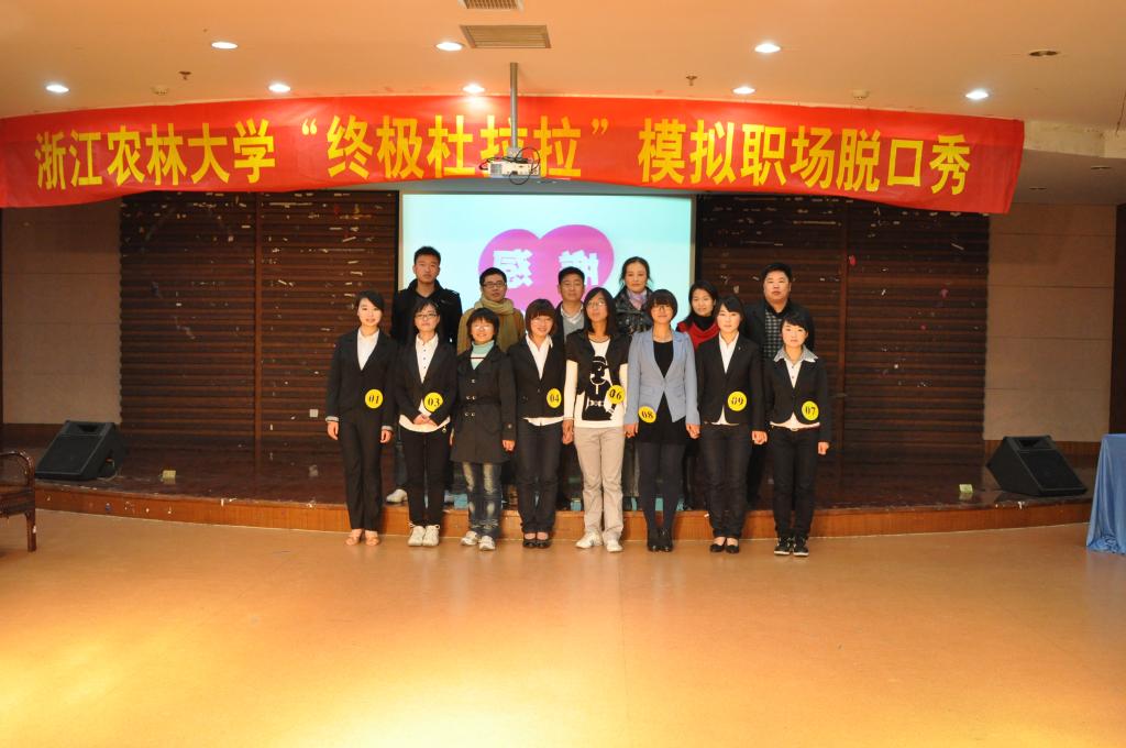来自不同学院的九名靓丽女生分成三个小组参加了本次脱口秀。在律动的背景音乐声中,她们信心十足地走秀出场。面对“职场通行证”——压力面试和“职场新干线”——潜力激发的考验以及考官犀利的问题,九名选手沉着冷静,应对自如,展现当代女大学生的才情与智慧。最后,经过激烈的PK赛,8号周劭伊、6号禇倩倩、1号杨梦瑶分别获得“终极杜拉拉”的冠亚季军;第三组获得最佳团队奖。