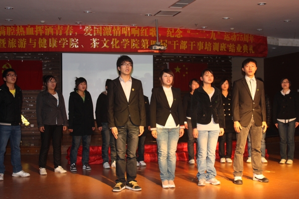 满腔热血挥洒青春,爱国激情唱响红歌。为纪念“一二·九”运动75周年,12月9日晚,旅游与健康学院、茶文化学院在绿梦休闲吧举行纪念“一二·九”运动红歌大合唱比赛暨学院第四期学生干部培训班结业典礼。学院党政领导、校团委相关指导老师、辅导员、新生班主任、全体2010级新生参加了本次活动。