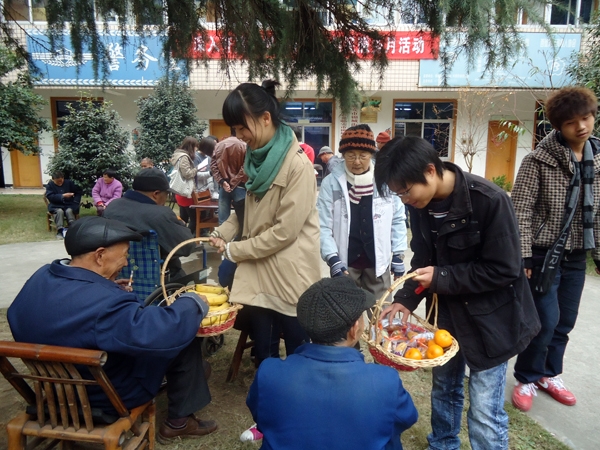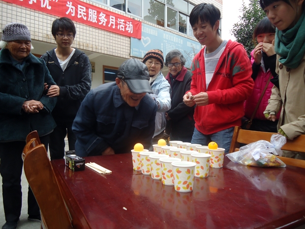 活动伊始,主持人为老人们安排了一个小型见面会并请锦城敬老院负责人致辞。随后,歌曲《祝福》、《军中绿花》、《北京欢迎你》等相继上演,猜谜语、吹乒乓球、插竹筷等小游戏让老人们脸上布满了笑容,而分发水果的环节更是让老人们乐开了怀。伴随着一锅热腾腾的饺子的新鲜出炉,两个小时的见面会在欢声笑语中结束了,同学们与老人们围坐在一起共同分享美味成果。