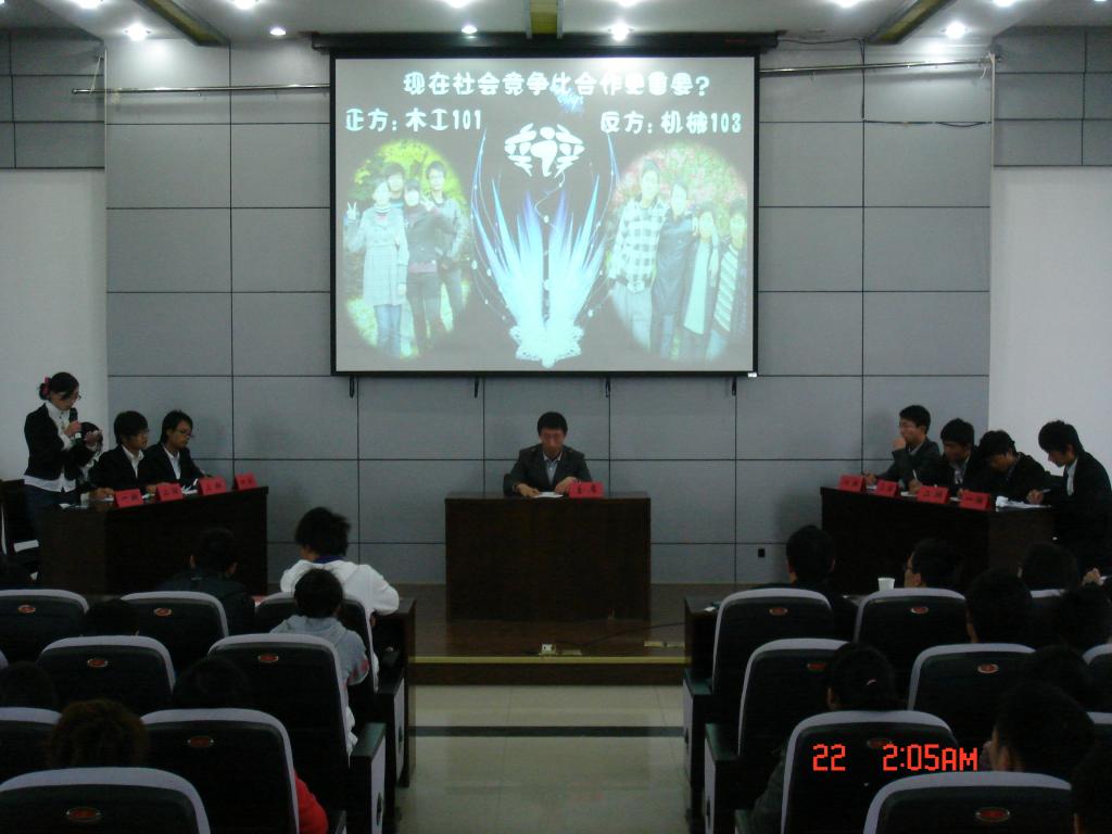 辩论赛中,木工101班和机械103班就“社会生活中竞争和合作哪个更重要”展开了激烈的辩论。双方辩手对辨题进行了深刻的剖析,句句切中辩论要点,从容而有力度。在决赛中,工业101班和机械105班的辩手言辞巧妙,用自己的沉重冷静和十足的信心对“大学生应该先择业后就业还是先就业后择业”展开了剖析,从破题立论到总结陈词,正反双方不分上下,举出了大量例子来支持论证自己的观点。比赛过程中现场不时爆出阵阵热烈的掌声。