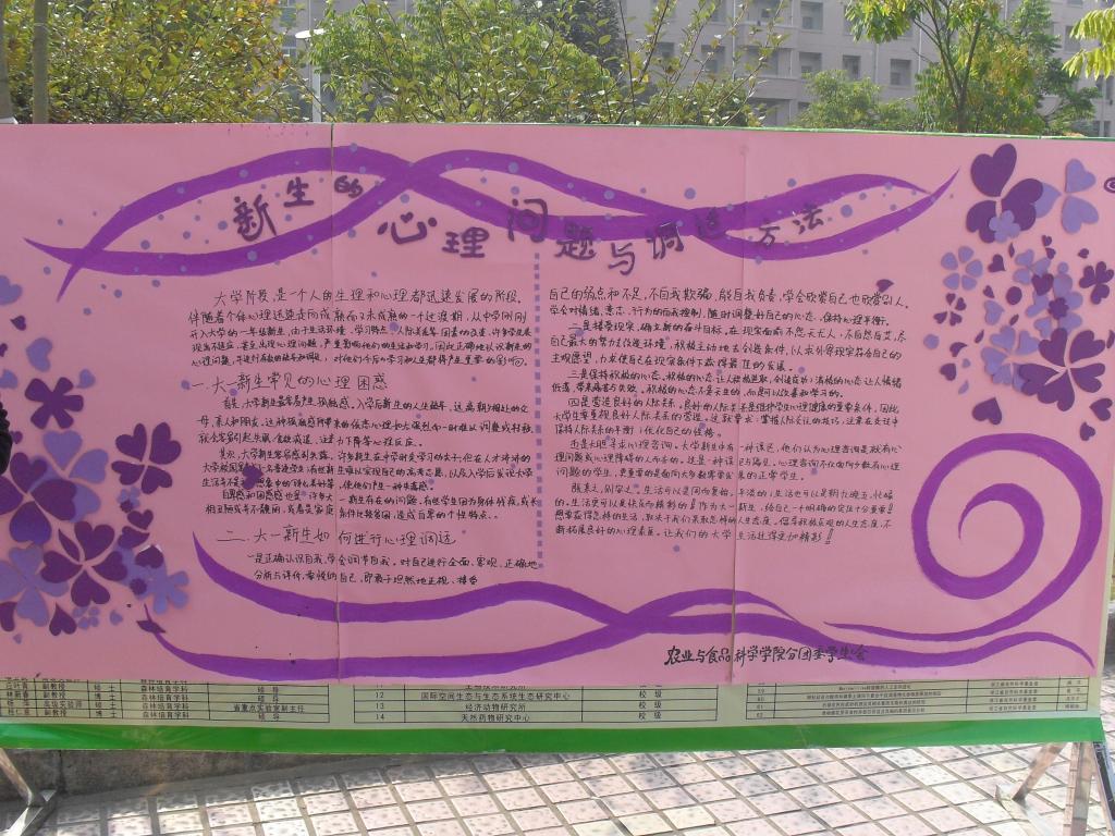 农业与食品科学学院学生会心理健康部举行了以“做阳光大学生,给心灵一片晴空”为主题的大型签名活动。活动通过展板、横幅、书签等形式向同学们展示了关于心理健康的一些信息内容,如学习如何避免心理问题、如何调试心理问题等。同学们仔细观看了这些相关内容与信息后,十分郑重地在横幅上签下了自己的名字。