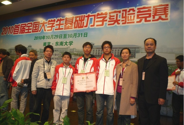 2010首届全国大学生基础力学实验竞赛于10月29日至31日在南京东南大学举行,包括有18所“985”高校、数十所“211”高校在内,全国共有96所高校进入决赛阶段的比赛,有57所高校按决赛成绩获得团体名次。我校土木工程专业杨潮军、顾明浩、刘漳三同学在初赛(个人)取得三等奖(入围资格)的基础上,组队代表学校参加了决赛(团体)阶段的比赛,获决赛团体二等奖,参赛个人也均取得了二等奖的成绩。