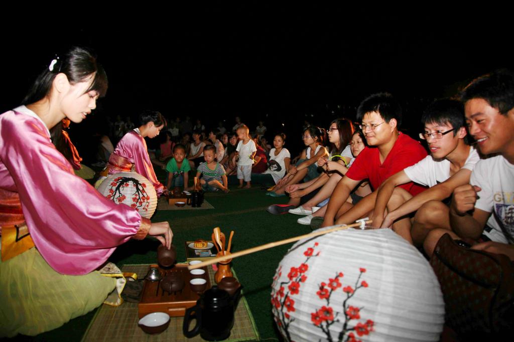 本次茶会在以往茶艺表演和品茗的基础上,新增添了灯谜、歌曲、小品、竞猜(月月欲试——关于中秋的字谜,茶的小知识)、舞蹈、瑜伽等节目。丰富多彩的节目不仅增强了茶会的可观赏性,更贴近于“茶为时尚饮”的主旨,也使大家在时尚与传统的碰撞中获得不一样的心灵感悟和净化。“心灵茶会”的茶艺表演由茶文化专业的同学们带来。他们身着汉服在月夜下冲泡一杯好茶,与观众共品香茗,在宣传茶文化、中秋文化的同时也宣传了汉文化,宣传了中国传统文化。
