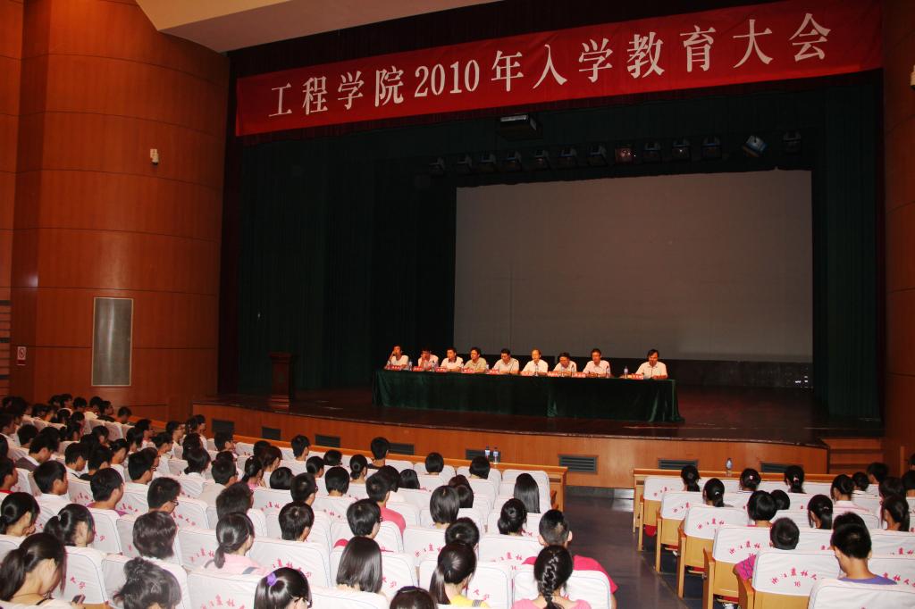 9月14日晚,工程学院2010入学教育大会在东湖影剧院举行,开展入学教育和军训动员。学院党政领导、学科带头人、各系负责人、各班班主任、辅导员及2009级和2010级千余名学生参加了大会。会议由党总支副书记李光耀主持。