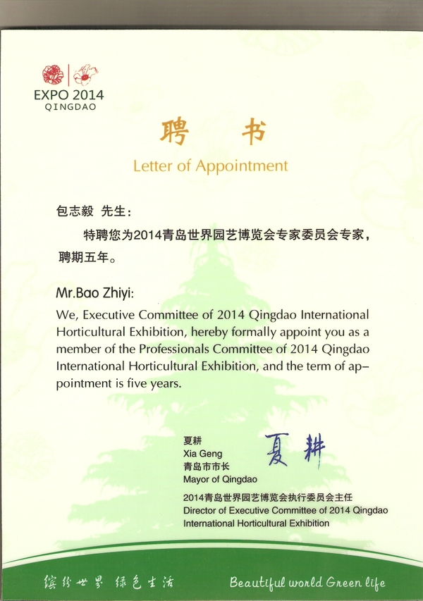 受2014青岛世界园艺博览会执行委员会、青岛市人民政府聘请,我校园林学院包志毅教授受聘担任2014年青岛世界园艺博览会专家委员会专家,出席了8月25—26日在青岛举行的2014年青岛世界园艺博览会高层专家座谈会,为博览会规划和建设出谋划策。
