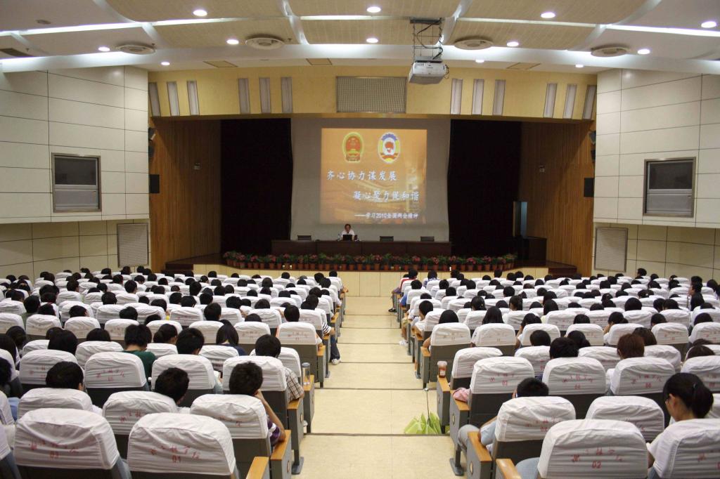 汪士华以“齐心协力谋发展凝心聚力促和谐”为主题,引领同学们深入学习2010年全国“两会”精神和政府工作报告及“两会”关注热点。他指出,今年全国“两会”更加尊重民意、更加注重民生,是一次民主的大会、团结的大会、求实的大会,也是一次奋进的大会;他用温总理的话与在座学生共勉,希望同学们对祖国及自己的未来充满信心。