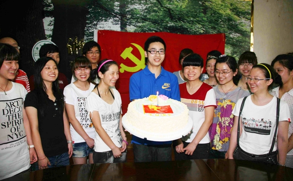 在鲜红的党旗下,学生党员们面向党旗,大声宣读入党誓词,重温自己一生当中光荣、神圣的一刻。他们手捧生日蛋糕,齐唱生日歌,共同庆祝中国共产党创建89周年。
