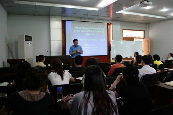 两位专家分别从GIS和遥感技术方面解释了空间分析技术及其在社会经济研究中的应用。报告介绍了国外空间分析技术的发展,并结合人口迁移、公共卫生、公共管理和土地利用等问题的研究案例,生动诠释了空间分析技术在社会科学研究中的广泛应用。报告指出,从国内外的研究来看,社会科学研究重心已由定性向定量转移,规范研究向实证研究转移,研究空间也由平面向三维转变,多学科的交叉与合作成为国际研究的发展趋势。空间分析技术的应用,挖掘传统统计方法中不易发现的问题,拓展了研究思路,增加了社会科学研究的科学性,为政府提供公共管理决策依据。