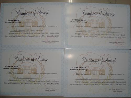 经过4场分组会议,我校代表队一举拿下了中、英文会场的“最佳代表队奖”,吴薇薇和张丹青还分别荣获了“最佳代表奖”,徐金锋老师获得“最佳领队奖”。