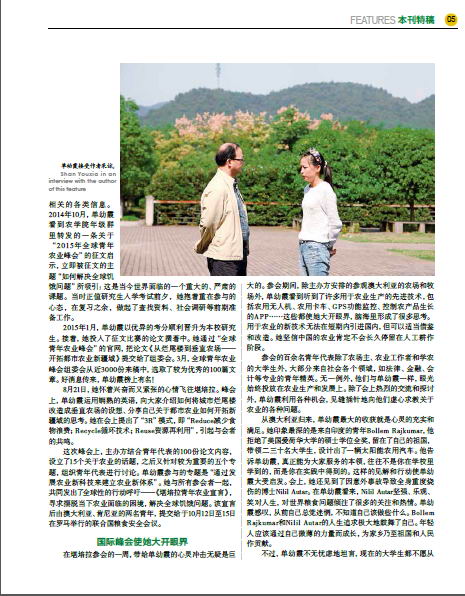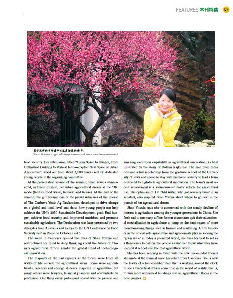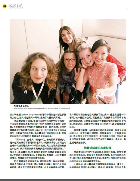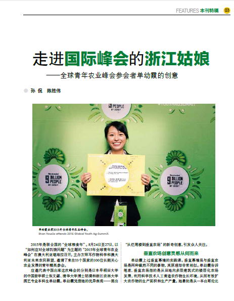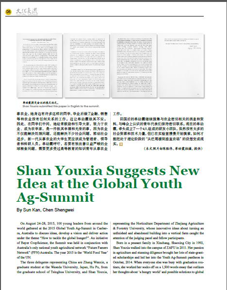《走进国际峰会的浙江姑娘》报道的是我校学生单幼霞参加了2015年澳大利亚“全球青年农业峰会”,作为参会的100名青年领袖中唯一的中国女生,单幼霞充分展示了中国青年大学生的风采,向全世界展现了中国农林大学生对农业事业的责任和热爱。