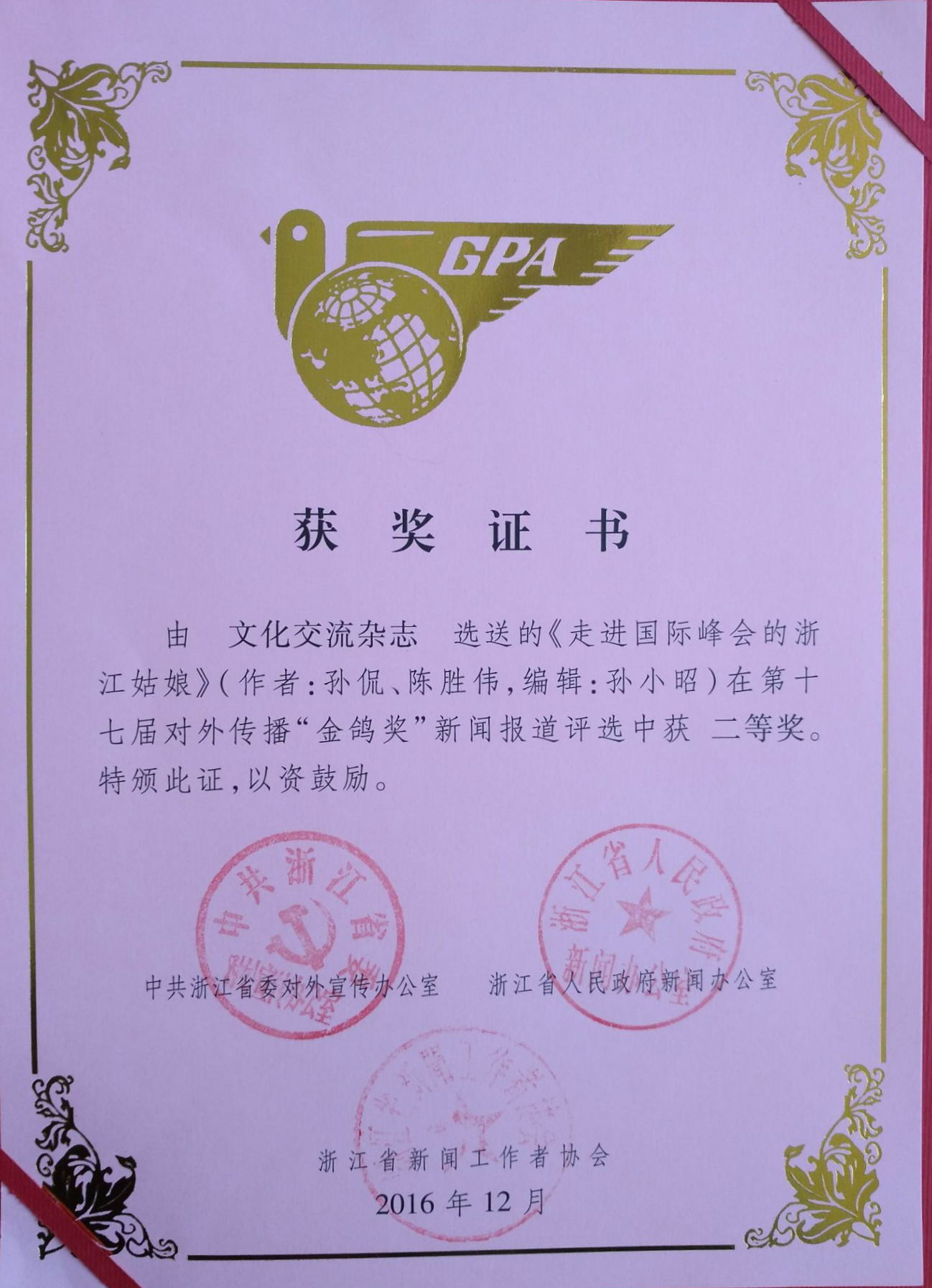 近日,浙江省对外传播“金鸽奖”评选结果揭晓,由记者孙侃和我校宣传部陈胜伟共同采写,并发表在《文化交流》杂志上的新闻作品《走进国际峰会的浙江姑娘》荣获“金鸽奖”二等奖,获奖作品同时获得“浙江新闻奖”。