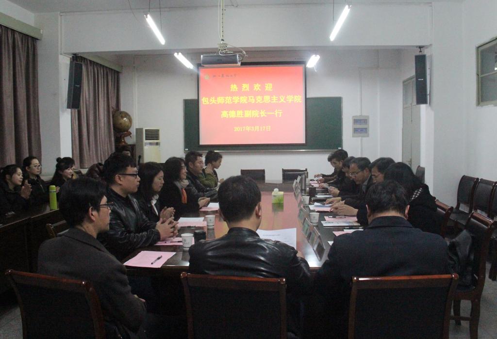 3月17日,包头师范学院马院副院长高德胜一行来我校交流,并护送第一期该院思政教育专业4名硕士研究生来校学习。双方围绕合作主题进行了友好交流,达成推进合作的共识。