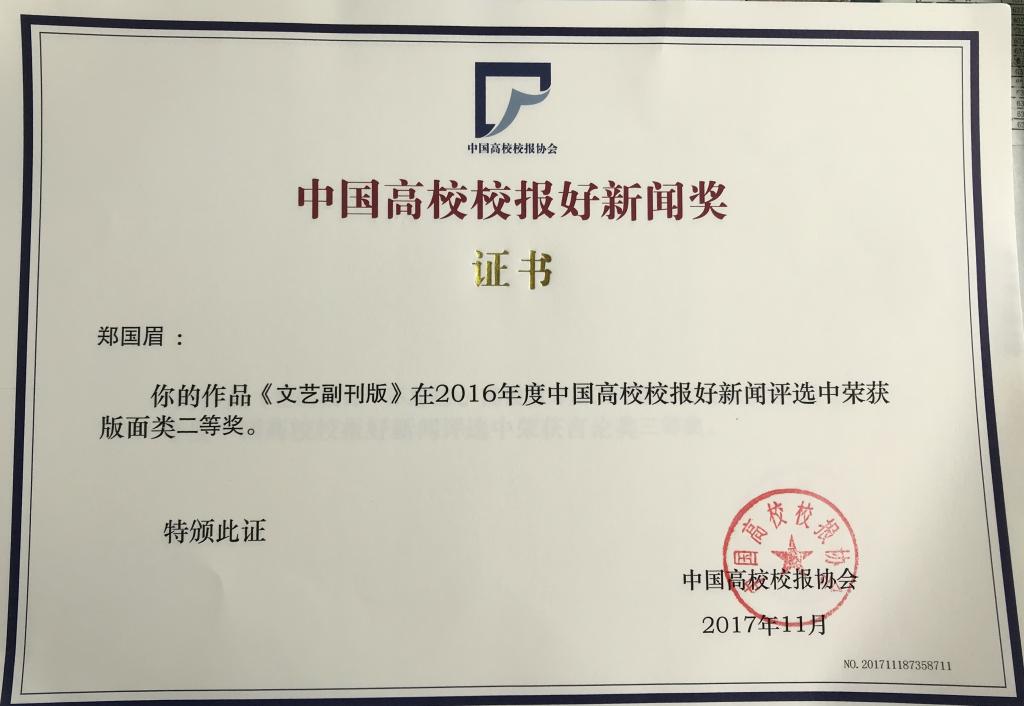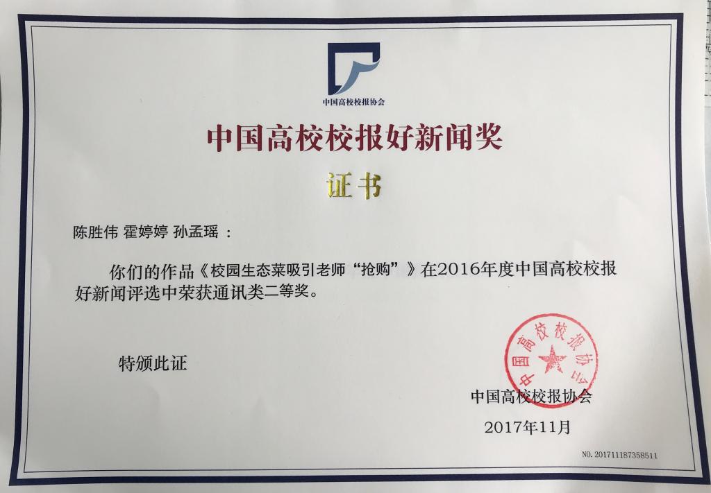 近日,2016年度中国高校校报好新闻评选结果公布,我校选送的4件作品获等级奖。其中《校园生态菜吸引老师“抢购”》荣获通讯类二等奖;《文艺副刊版》获版面类二等奖;《爱的教育 不忘初心 高校辅导员工作需要实现本质回归》获言论类三等奖;《我校助力贤良打造“乡村植物园”》获新闻摄影类三等奖。