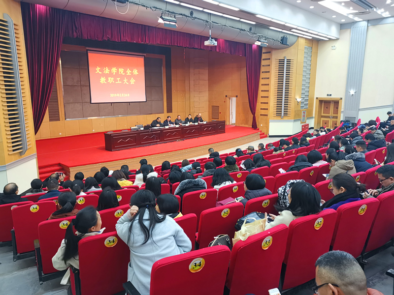 2月24日下午,文法学院在衣锦报告厅召开全体教职工大会,会议由文法学院院长王长金主持。