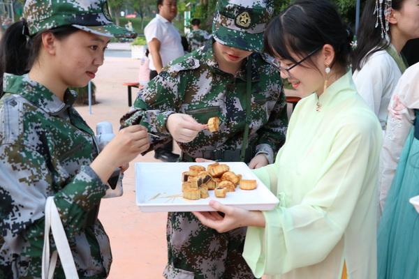 当军训遇上中秋节,新生们独在异乡定倍思亲。餐饮服务中心准备了千份月饼专用于军训团体互动时的活动奖励。同时开展了分食月饼活动,邀请校学生会汉服协会的同学在食堂门口免费分享月饼,传递出了一份别样的祝福和心意。