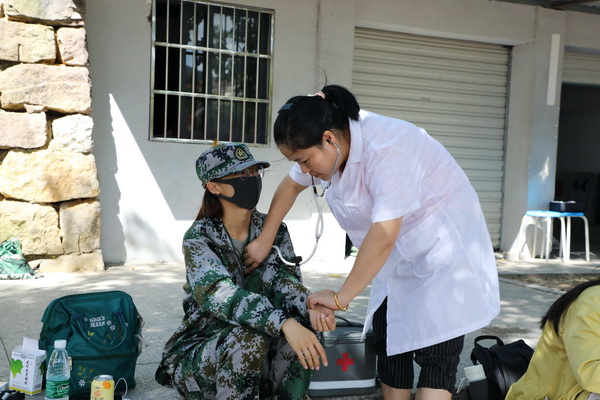 医疗保障全程守护,24小时全天待命服务。医务人员守候在军训场地,药箱里备齐了防暑降温、感冒、外伤、腹痛腹泻等相关药品。针对中暑、眩晕、扭伤等突发状况,现场及时采取应急救护措施。