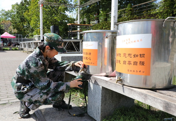 连日的大太阳,每天多小时暴晒,极易中暑。餐饮服务中心在军训场地、篮球场等多地设立饮用水服务点,每天不间断供应凉茶,让新生和教官能够及时补充水份满足身体所需。从早晨6:00就着手准备,每天供应到17:30,并派专人在各点巡视,确保军训期间茶水满桶。平均每天供水量10余桶。