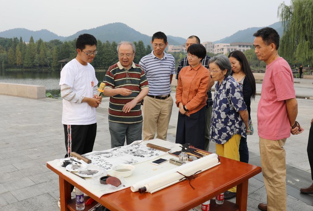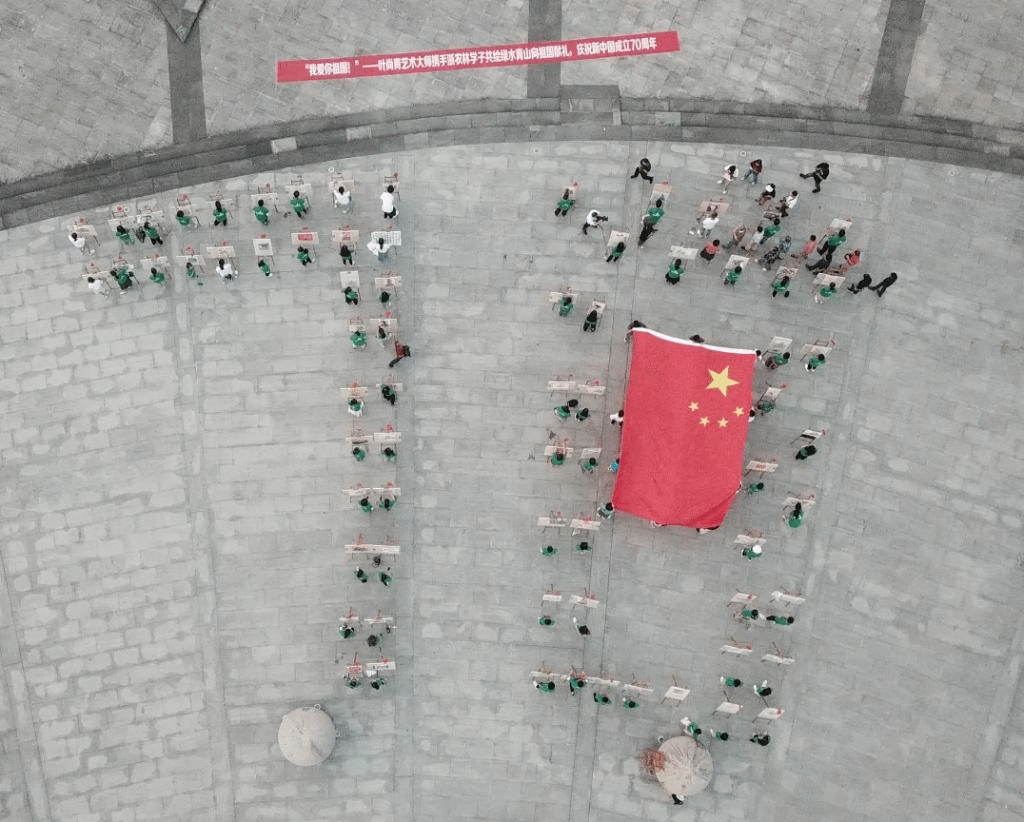 金秋九月,国庆前夕,学校东湖畔国旗飞扬。9月26日,学校开展“向祖国献画,庆祝新中国成立70周年”活动。我国著名的书画家,美术教育家、诗人叶尚青与70位19级艺术设计学院学子绘绿水青山,向祖国母亲献礼。活动吸引了临安电视台等多家媒体关注报道。