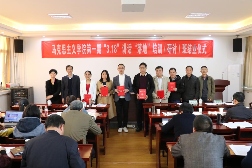 为深入贯彻习近平总书记在学校思想政治理论课教师座谈会上的讲话精神,推进学院“3.18”讲话“落地”培训活动获得实效,11月14日,马克思主义学院举办了第一期“3.18”讲话“落地”培训(研讨)班结业式。湖州师范学院社会发展与管理学院院长王伦光教授、学校督导组组长胡云江以及全国优秀教师雷家军教授应邀出席,学院领导、专兼职思政课教师及部分研究生和本科生参加了此次结业式。