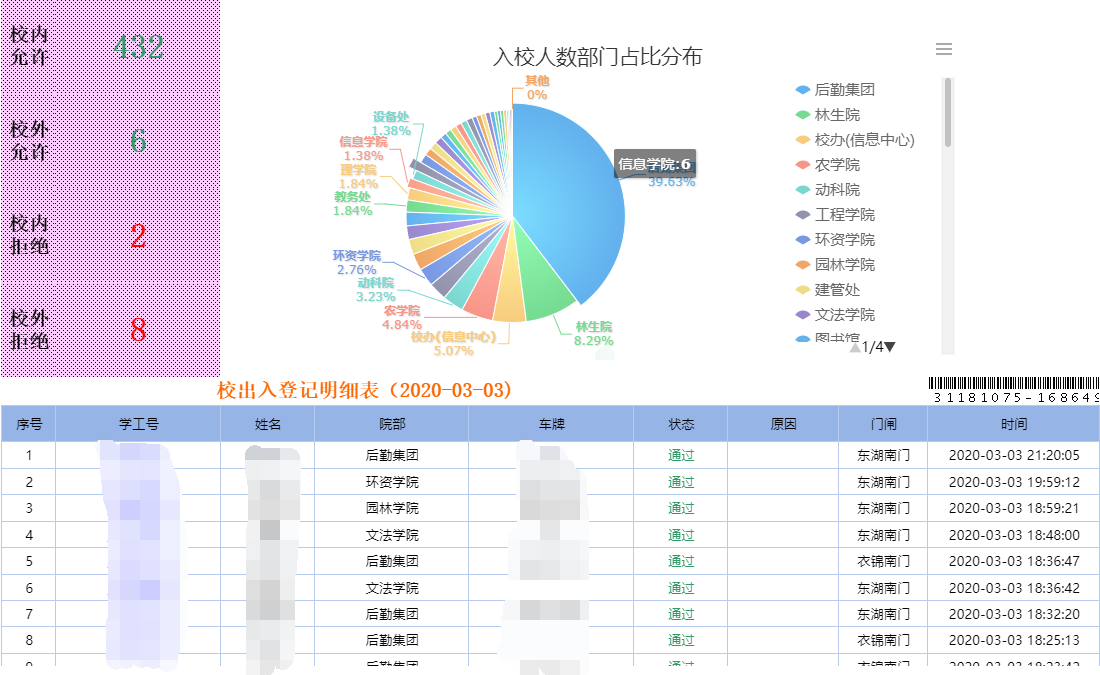 为保证校园半封闭式管理的同时不影响学校工作的正常开展,信息中心技术员紧密对接省教育厅、省大数据局数据平台,在“每日一报”平台的基础上,紧急上线了“校园通行码”。校园通行码”是在杭州市健康(绿码)的基础上,通过“每日一报”的最近14天体温和个人轨迹档案,进行大数据研判后加人工审核生成的。进出校园师生可通过线上提前申请,学校保卫门岗扫码核验可马上知晓入校人员情况,整个过程不超过3秒,校门口大屏直接同步登记。最大程度节约师生进校时间,也真正为一线防控人员松绑减负。3月3日当日截止发稿前进校情况:校内允许405人,拒绝2人;校外允许6人,决绝13人。
