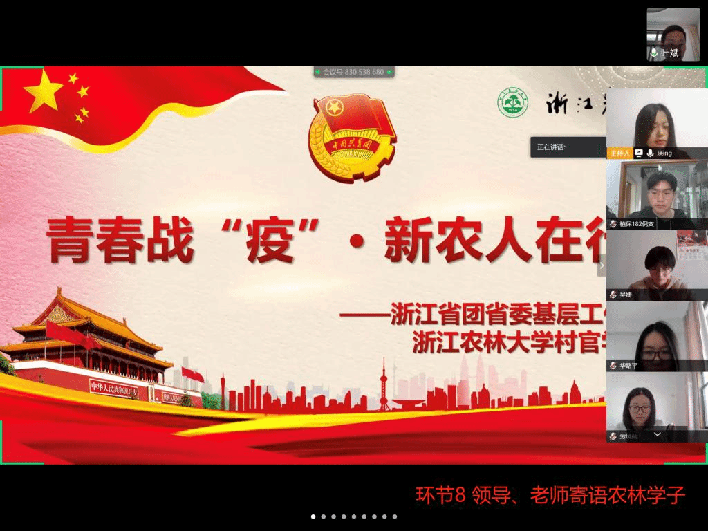 为引导青年学生强化责任和担当意识,在疫情防控中上好“成长课”,引领我校全体青年学生严格遵守防控举措、有序参与防控工作,4月9日,村官学院组织浙江省“新农人”创新实验班开展了以“青春‘战疫’,新农人在行动”为主题的“云端”团日活动。