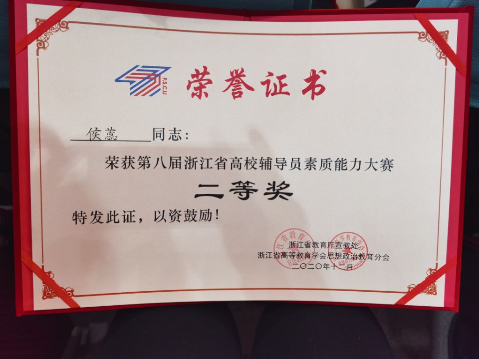 近日,由浙江省教育厅宣教处、浙江省高等教育学会思想政治教育分会主办的第八届浙江省高校辅导员素质能力大赛举行。浙江省共87所高校的106位辅导员参加了比赛,我校环资学院辅导员侯蕊在众多参赛选手中脱颖而出,获二等奖。